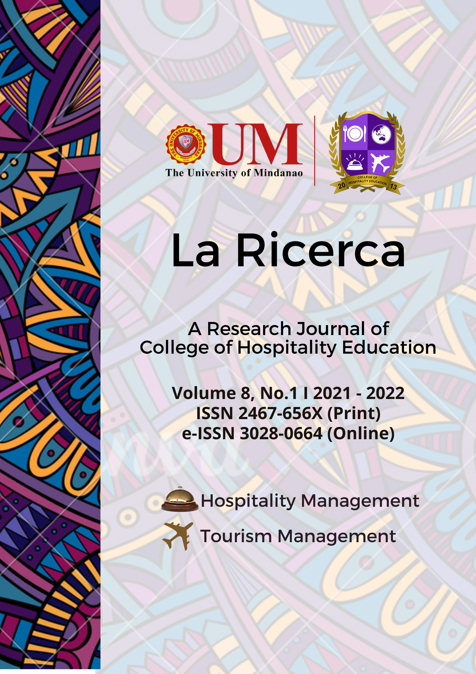 Vol. 8 No. 1 (2022)The La Ricerca was envisioned to represent the growing needs of tourism and hospitality research in achieving advancements and sustainable development. Its mission to be the voice of diverse researchers and and scholars not only in the University of Mindanao but also other schools in the country and the world in addressing and suggesting solutions to global problem based on sound research.