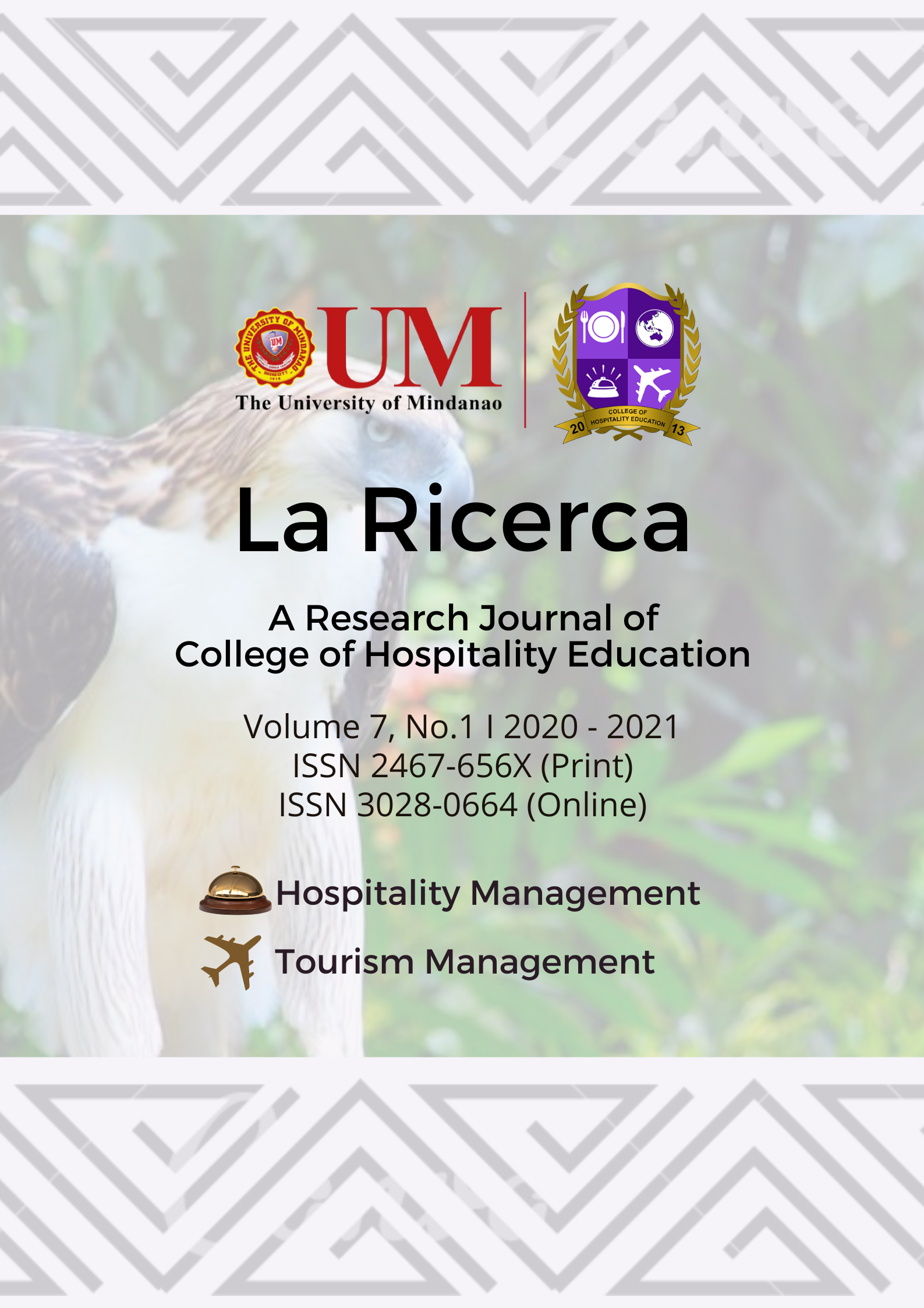 Vol. 7 No. 1 (2020)The La Ricerca was envisioned to represent the growing needs of tourism and hospitality research in achieving advancements and sustainable development. Its mission to be the voice of diverse researchers and and scholars not only in the University of Mindanao but also other schools in the country and the world in addressing and suggesting solutions to global problem based on sound research.
