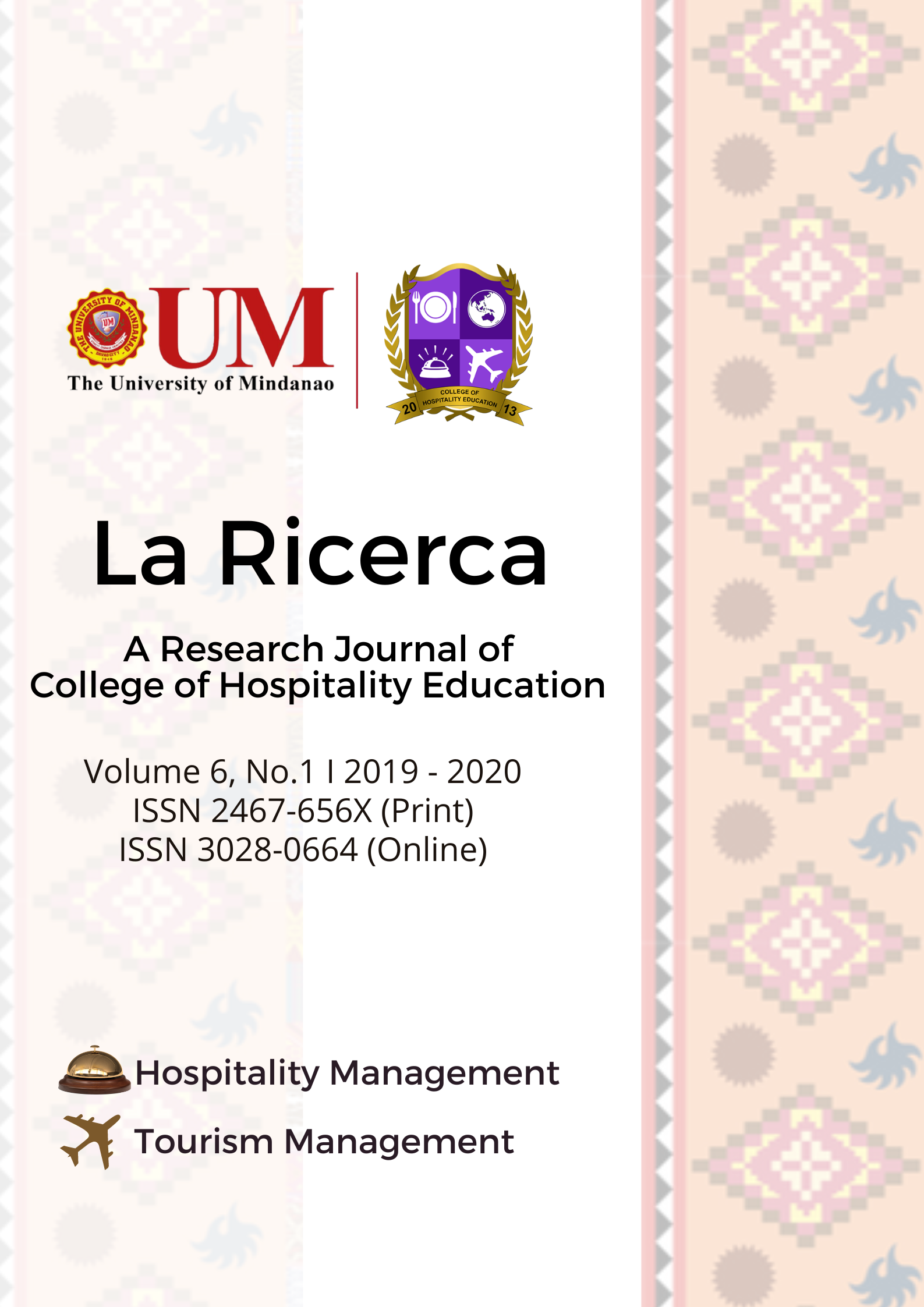 Vol. 6 No. 1 (2019)The La Ricerca was envisioned to represent the growing needs of tourism and hospitality research in achieving advancements and sustainable development. Its mission to be the voice of diverse researchers and and scholars not only in the University of Mindanao but also other schools in the country and the world in addressing and suggesting solutions to global problem based on sound research.