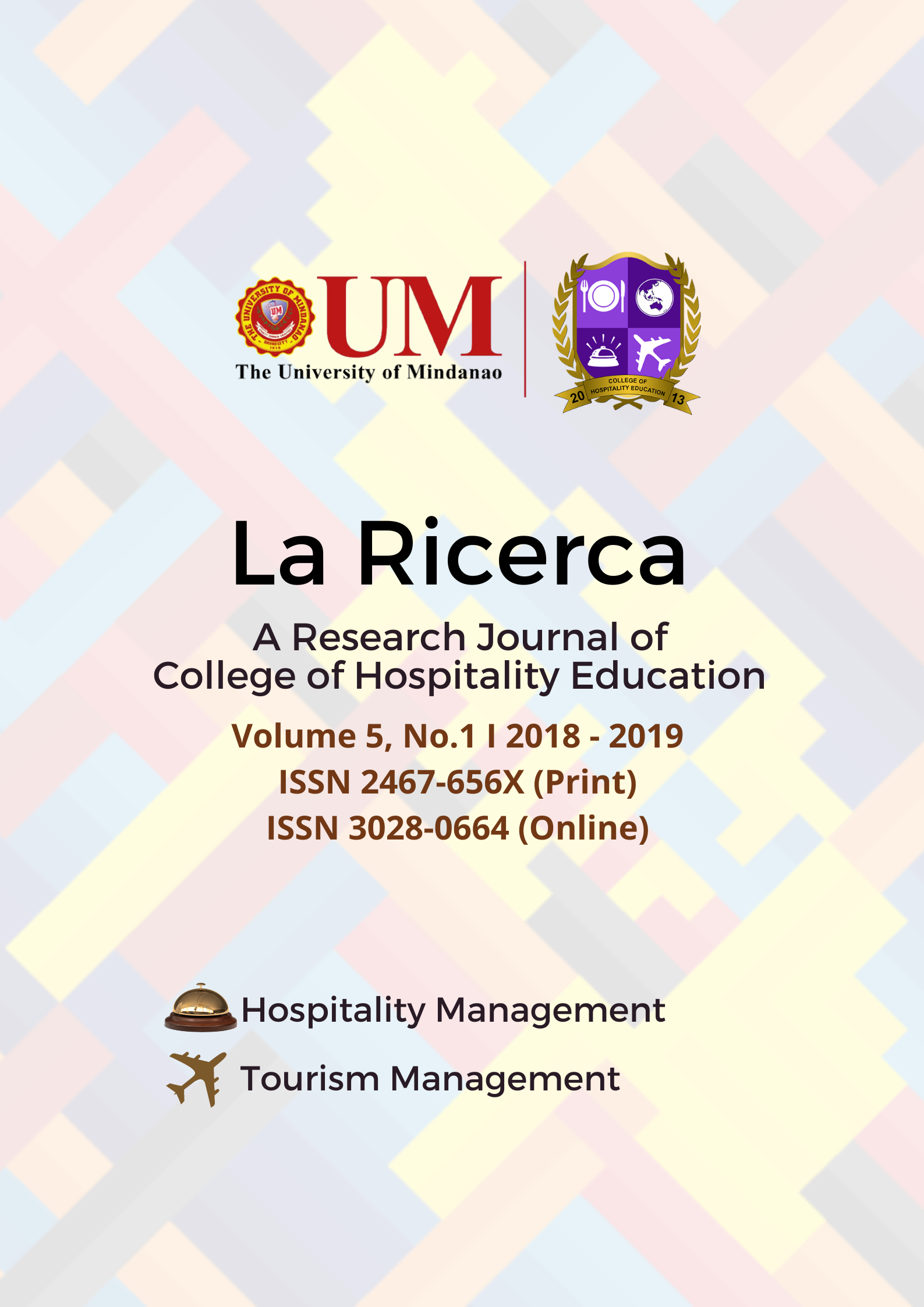 Vol. 5 No. 1 (2018)The La Ricerca was envisioned to represent the growing needs of tourism and hospitality research in achieving advancements and sustainable development. Its mission to be the voice of diverse researchers and and scholars not only in the University of Mindanao but also other schools in the country and the world in addressing and suggesting solutions to global problem based on sound research.