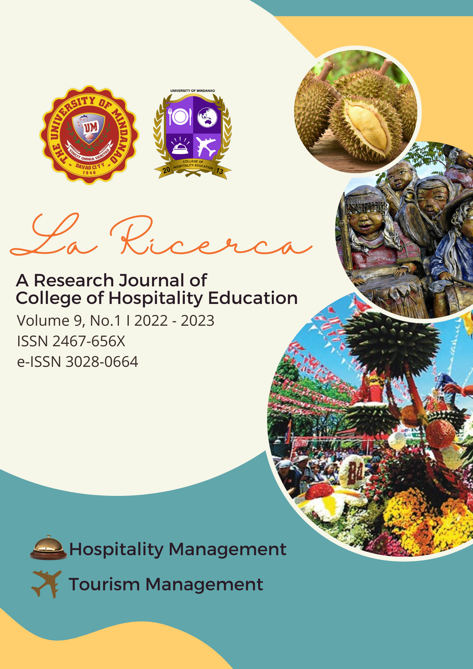 Vol. 9 No. 1 (2023)The La Ricerca was envisioned to represent the growing needs of tourism and hospitality research in achieving advancements and sustainable development. Its mission to be the voice of diverse researchers and and scholars not only of the University of Mindanao but also other schools in the country and the world in addressing and suggesting solutions to global problem based on sound research.